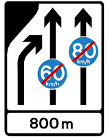 The example sign below shows a warning of a speed limit by lane 3000m ahead with a lane added, on a primary route: